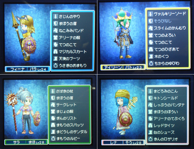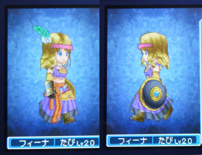 引き続き、「ドラクエⅨ」をプレイ。さっそく、グビアナ城のクエストをクリアさせる。地下ダンジョンに潜って、ボスモンスターを倒したら、フィーナ(パラディン)がそこそこレベルアップして最前線で使えるようになった。…なので、次はアイリーンを戦士からバトルマスターに転職させることにした。だがそれには、まずバトルマスターのクエストをクリアしなければならない。戦法として、フィーナの特技の応援でアイリーンをハイテンションにさせる→スライムが逃げないようにレナ(僧侶)がラリホーを連発→アイリーンはひたすらスーパーハイテンションになるまで待つ。…にしても、応援するフィーナが可愛すぎだよ☆。そうこうしている内にクエストクリアで、はれてアイリーンはバトルマスターに転職することが出来た。そして、その後で気がついたのだが、ダーマ神殿に旅芸人のクエストがあった(笑)。クエストの内容は、また応援かよ、orz。最初に気がついていれば、一気にふたつのクエストをクリアすることが出来たのにぃ。でも、苦労して手に入れた「踊り子のドレス」が可愛すぎ☆。さっそく、記念撮影(↓の写真)。ただ、パラディンのときに着れないのが難だ(笑)。やっぱ、旅芸人のままで行こうかな…っとマジで悩む(爆)。クエストと言えば、ミイラ男の包帯のクエストがあったなぁ…っと思い出し、グビアナ城の地下墓地に行き、ひたすらミイラ男を倒す。何とか、ブツを手にしてたところで、力尽きた。続きは明日だ。