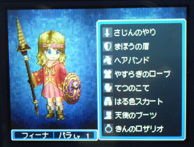 さて、装備は以前とほとんど変わっていない。ただ羽根飾りバンドと剣が使えないので、ヘアバンドに戻して、武器を槍に変えたくらいかな。その分、盾をパワーアップさせた。本当はビロードのマントを装備させたかったんだが、パラディンは装備できないんだよね。魔法の鎧は装備できるけど、可愛くないので却下(笑)。