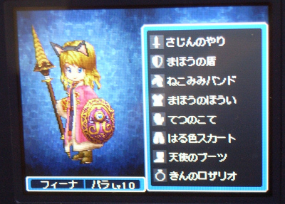 時間がないので、ちょこっとだけ「ドラクエⅨ」をプレイ。とてもクエストをクリアする時間がないので、フィールドをうろうろして、レベルアップを図る。Lv1と言っても、取得経験値が多いので、みるみるレベルアップ。一応、レベルが10になったところで今日は終了。あと、防具屋で売っていた魔法の法衣が結構可愛かったので、久しぶりに衣装換えした。ついでに某クエストの為に購入したねこみみバンドをそのまま着用(笑)。