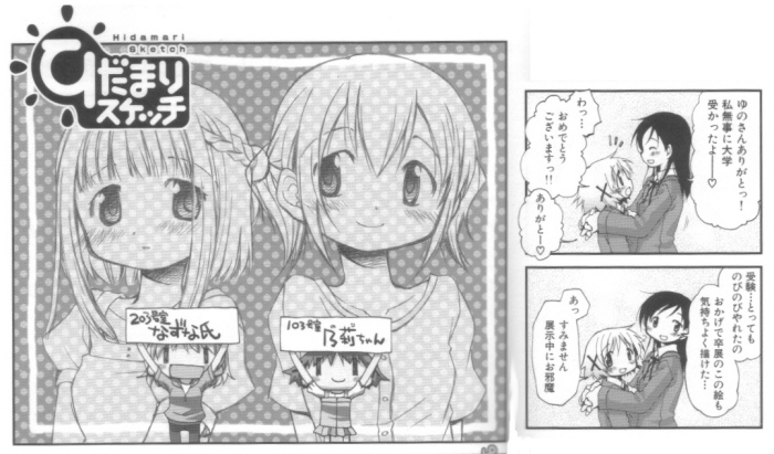 今巻はアニメ化されていない部分なので、新鮮に読むことが出来た。また見どころも多かった。ひとつはゆのっちと先輩の有沢さんの百合百合な関係(写真右)。メアドを交換している仲なので、また出てくる可能性大だ。もうひとつはひだまり荘の新住人のなずなちゃんと乃莉ちゃん(写真左)。特になずなちゃんの可愛さと言ったらもう☆。ゆのっちより可愛いかも☆