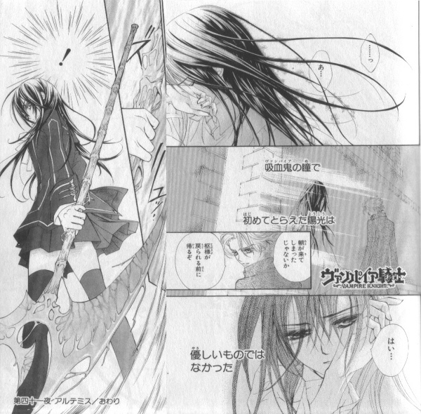9巻は、本当の敵と思われる存在が登場。こいつは優姫の過去にも関わっている。…っと言うことは、最終回が近いと言うことだな。対吸血鬼用ロット「狩りの女神(アルテミス)」を巨大な鎌に変え、敵に挑む優姫がカッコよすぎ!。この凛々しい姿を見るだけで、優姫に惚れちゃうよ☆。もっとも朝陽を辛そうにして顔を背ける優姫のほうが妖艶で、より私好みなんだけど(笑)。