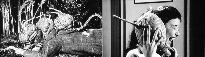 以前から非常に気になっていた作品だったが、今までまったくソフト化されなかったので、観ることが出来なかった。しかし今回の初ソフト化で、ようやく観ることが出来た。…で感想だが、これがなかなか面白い。殺人を犯しているモノの正体だが、すでにあちらこちらで書かれているし、すでに有名になっているので、ネタバレを承知で書くが、これがなんと「イドの怪物」。人間の潜在意識によって生み出された怪物で、人間の脳と脳髄を会わせてたような不気味な姿をしている。この怪物がストップモーションアニメでぐりぐり動く様は、今観ても気色悪い。これが集団で襲ってくるクライマックスのサスペンスやスリルは、かなりのものだ。モンスターSFの傑作と言って良いだろう。