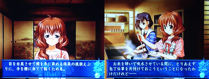 夕食までに掃除か夕食の用意か選択に迫られてたので、とりあえず保美を手伝って、夕食の用意をすることにした。するとこの娘、顔を赤らめてるよ。何となく百合百合な展開に突入しそうだったが(プレイヤーは女性キャラになります)、そのまま何もなく終了。まぁまだ始まったばかりだからな。しかしこの娘、病弱で大人しくて結構好みのキャラだ。しかし、お嬢さまの姫こと、綾代も捨てがたいし(苦笑)。