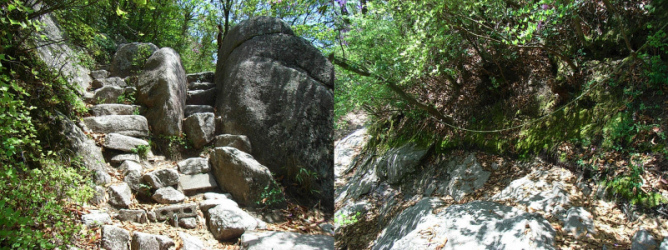 しかし、この山は初心者にはキツかった。斜面は急だわ、石段の高さは高いわで、大変だった。日頃の運動不足が原因ではあるが、初めから息が切れまくり。しかも、(写真の下左)はルートを探すのが大変だし、(写真の下右)はロープ伝いに登らなければ行けないし。もうこれはリアル「トゥームレイダー」だよ(笑)。もう少し、無難な山にすれば良かったかな?。